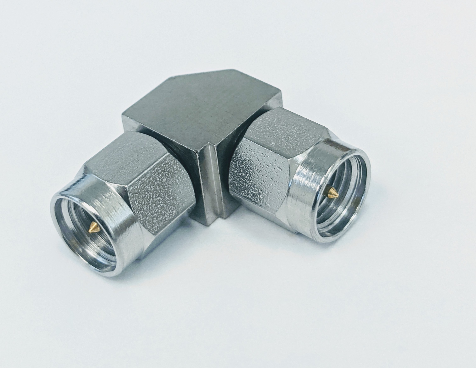 RF Adapter, SMA Male to SMA Male, mitered right angle. Frequency DC to 27 GHz, VSWR 1.2 max.