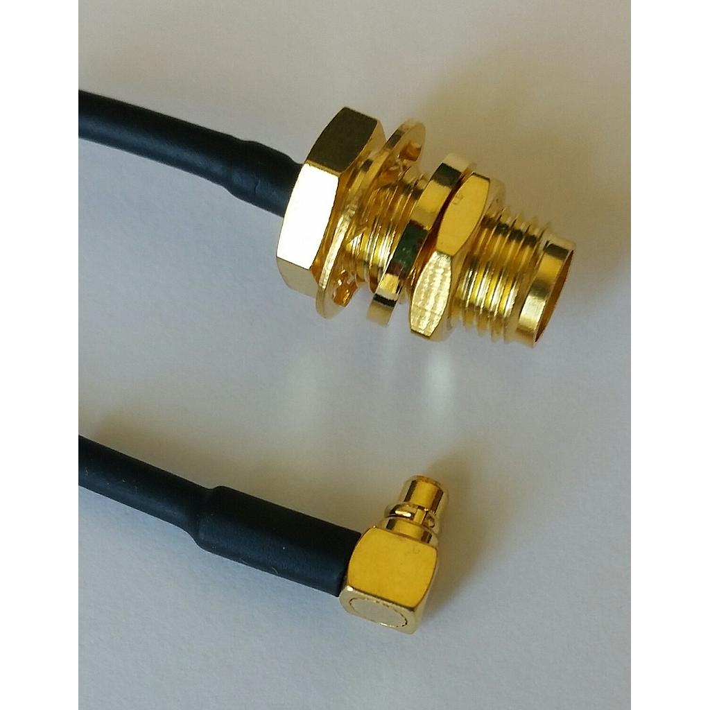 Cable Assembly, SMA Female Bulkhead to MMCX Right Angle Plug, 1.37mm Flexible Coax, 6.0 inches (Length defined from center of MMCX-RA to end of SMA bulkhead connector).