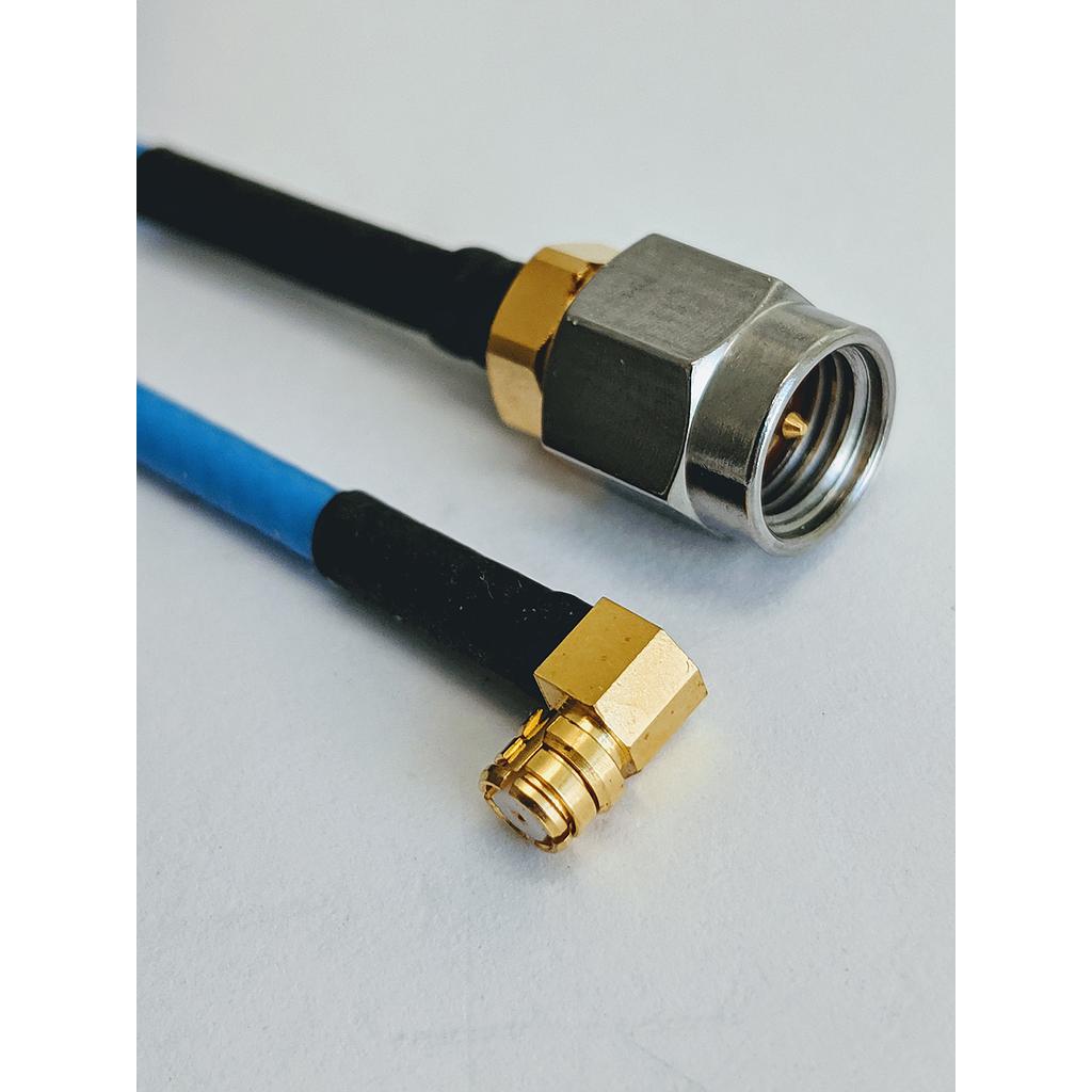 SMA Male to SMP Female Right Angle RF flex cable using SS085 High Performance Coax, 6 inches long, Operating to 18 GHz.